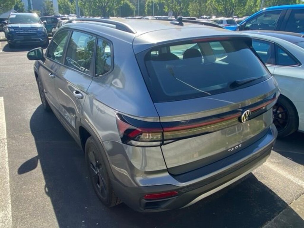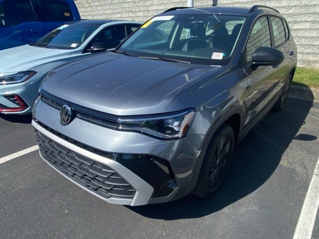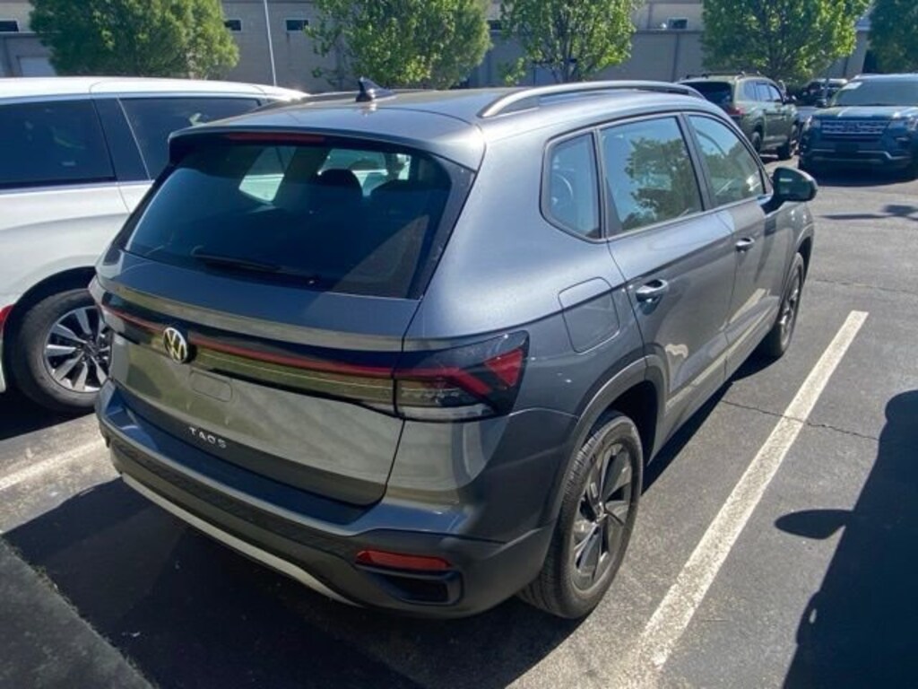 Platinum Gray Metallic 2025 Volkswagen Taos 1.5T S FWD 8-Speed Automatic with Tiptronic 1.5L I4 Turbocharged DOHC 16V LEV3-SULEV30 174hp Active Blind Spot Monitor, Auto High-beam Headlights, Brake assist, Electronic Stability Control, Exterior Parking Camera Rear, Fully automatic headlights, Radio: MIB3 Composition Color AM/FM, Rain sensing wipers, Rear window wiper, Remote keyless entry, Speed-sensing steering, Steering wheel mounted audio controls, Traction control, Wheels: 17" Dark Silver Painted Alloy.